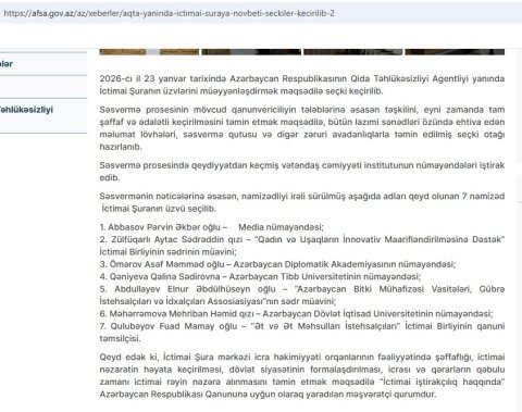Redaksiyamıza Azərbaycan Respublikasının Qida Təhlükəsizliyi Agentliyi (AQTA) yanında yeni İctimai Şuranın formalaşdırılması ilə bağlı maraqlı məlumatlar daxil olub. Məlumatlarda proses “seçki” kimi təqdim edilsə də, açıqlanan faktlar bu ifadənin hüquqi və məzmun baxımından nə dərəcədə əsaslı olduğu sualını doğurur. Bu yazıda mövcud məlumatları, qanunvericiliyin tələblərini və ortaya çıxan ziddiyyətləri ictimailəşdirməyə çalışacağıq.